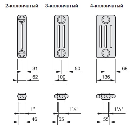 Габариты глубины 2-6 колончатых радиаторов: