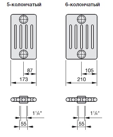Радиаторы, длина которых превышает вышеуказанные максимальные ограничения, поставляются отдельными блоками. Их сборка должна осуществляться с помощью ниппелей силами установщика. Соответствующие ниппели (для 2-колончатой модели – 1″, для моделей с числом колонок от 3 до 6 – 5/4″) поставляются бесплатно вместе с радиатором. В качестве уплотнителей допускается использование только прокладок, которые поставляются вместе с радиатором.